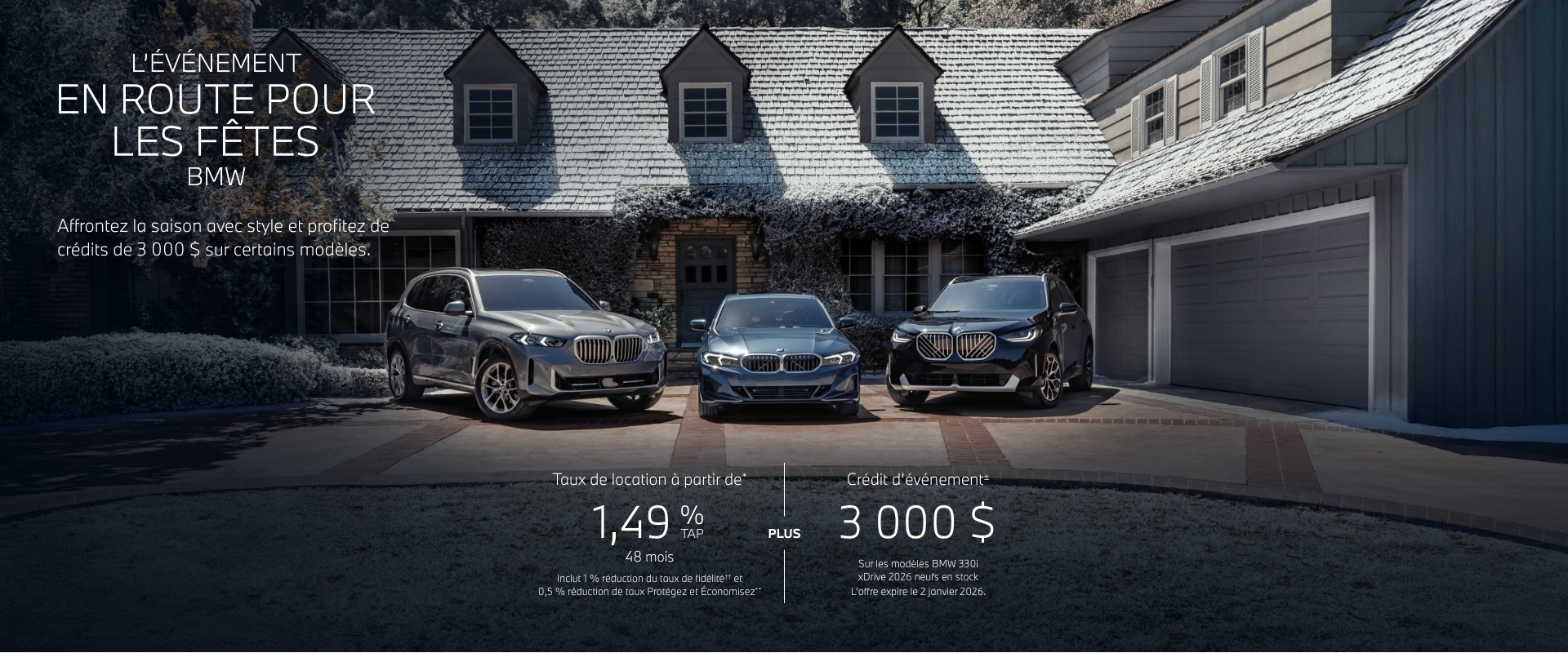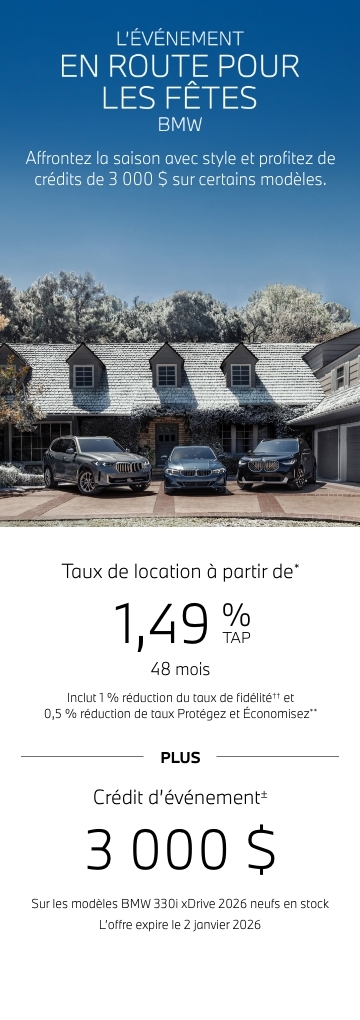 L’offre expire le 2 janvier 2026. La livraison doit être effectuée avant le 1er décembre 2025. Offre sous réserve de disponibilité et pouvant être annulée ou modifiée sans préavis. Certaines conditions s’appliquent. Consultez votre concessionnaire BMW local ou bmw.ca pour plus de détails.